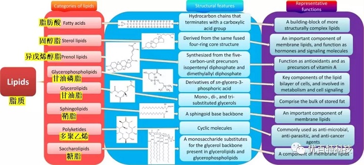 在脂質組學(lipidomics)檢測中,可將脂質分為脂肪酸(Fatty acids)、甘油脂(Glycerolipids)、甘油磷脂(glycerophospholipids)、鞘脂(Sphingolipids)、固醇脂(Sterol lipids)、異戊烯醇脂(Prenol lipids)、糖脂(Saccharolipids)和多聚乙烯(Polyketides)(見下圖)。