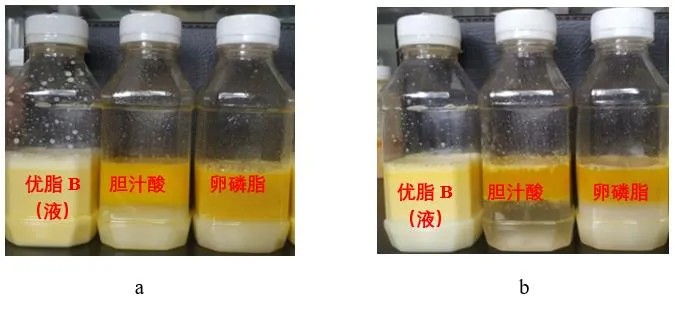 圖3. 不同乳化劑對油脂乳化能力的影響(a.破乳前,b.破乳后)