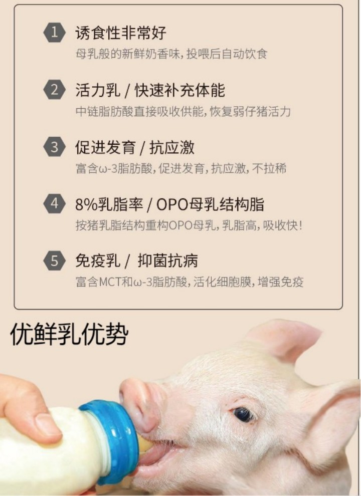 仔豬斷奶是從哺乳到生長階段的重要過渡,這一階段仔豬的營養供應必然會影響到仔豬未來的出欄時間,出欄體重,因此,選用好的斷奶方案對于養殖場的效益至關重要。市面上的仔豬奶粉花樣繁多,但有多少是仔豬無法消化的超市下架牛奶粉,有多少根本不含有OPO結構脂,何必要為一袋奶粉費力甄別,選擇濃濃豬乳味道的“優鮮乳”,告別仔豬腹瀉問題,提高仔豬斷奶窩重,為仔豬生長助力!