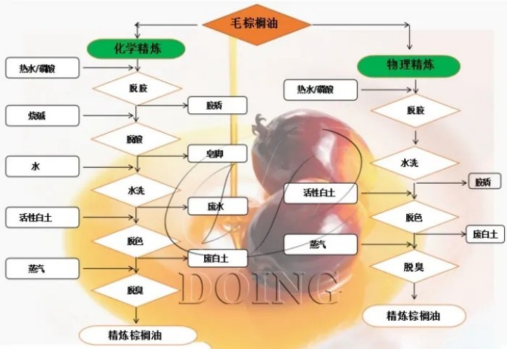 棕櫚油是從油棕樹上的棕果中榨取出來的。棕櫚果經水煮、碾碎、榨取工藝后,得到毛棕櫚油,毛棕櫚油經過精煉,去除游離脂肪酸、天然色素、氣味后,得到精煉棕櫚油及棕櫚色拉油。根據不同需求,通過分提,可以得到24度、33度、44度、55度等不同熔點的棕櫚油。